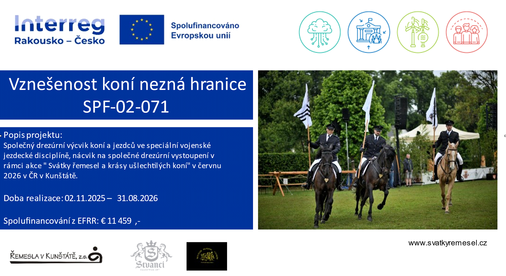 Projekt, který bychom rádi zrealizovali v rámci tradiční akce „Svátky řemesel a krásy ušlechtilých koní“ v Kunštátě v roce 2026 má za cíl propojit a zahájit dlouhodobou spolupráci všech účastníků projektu – žadatele a obou partnerů.